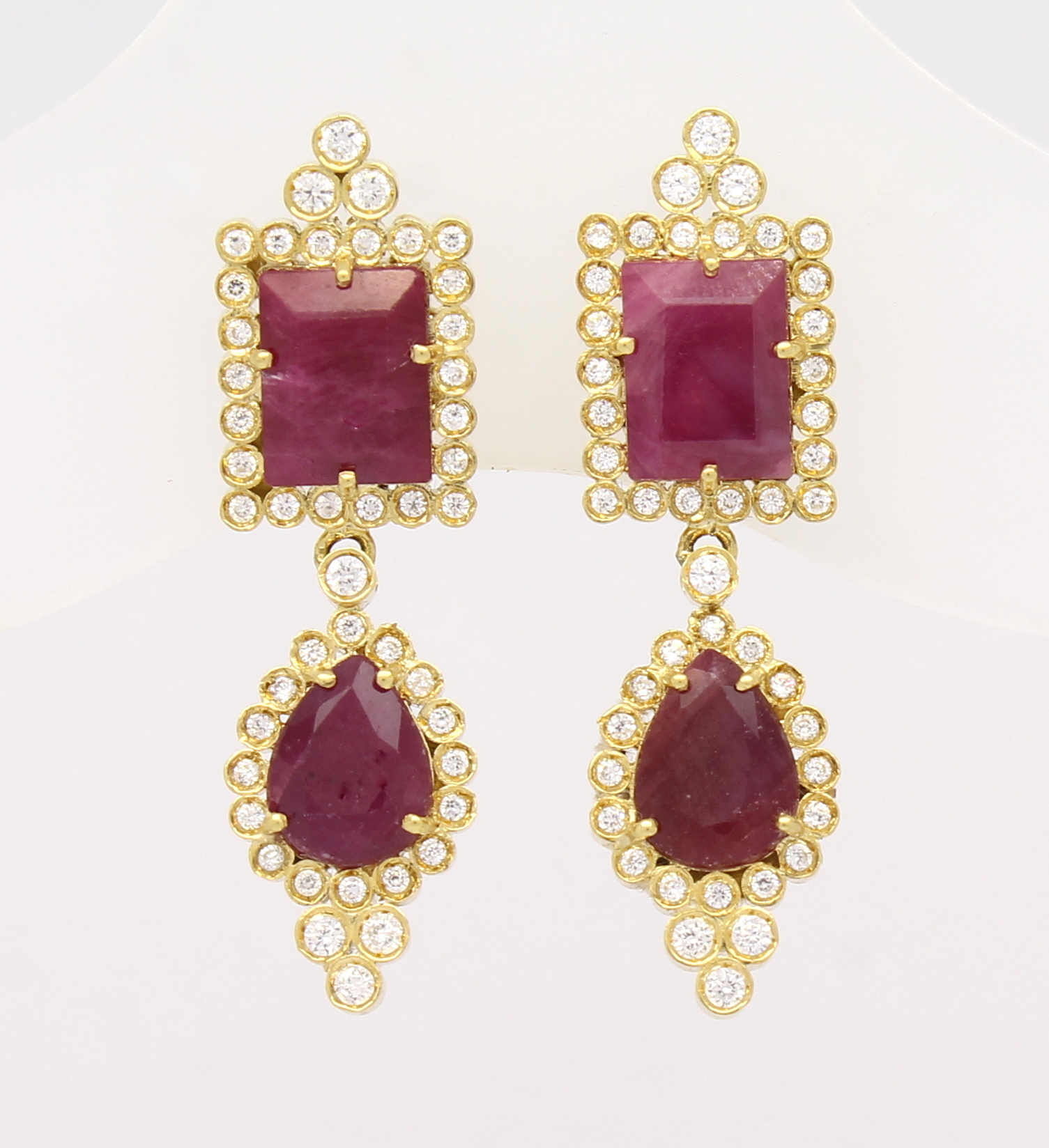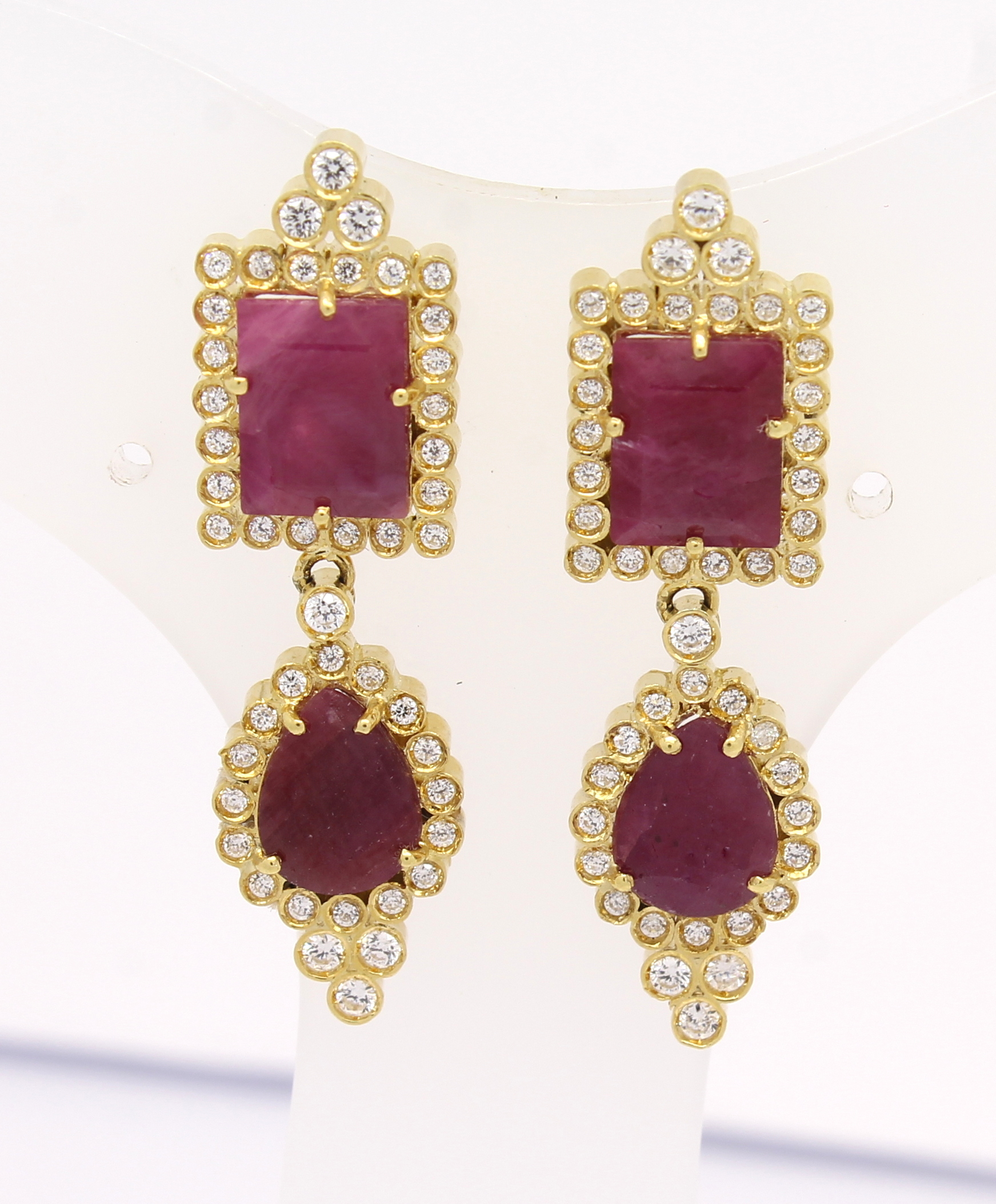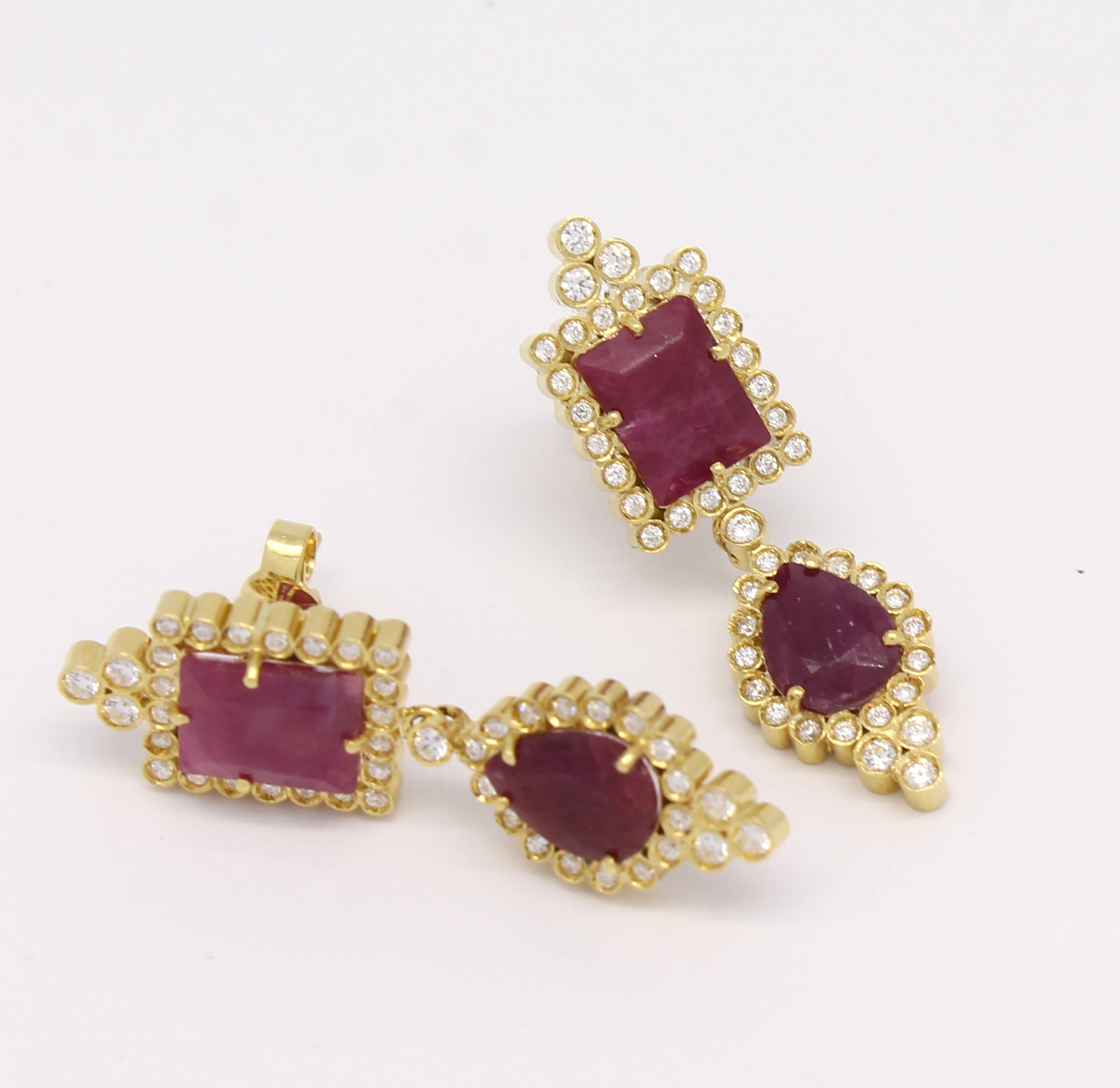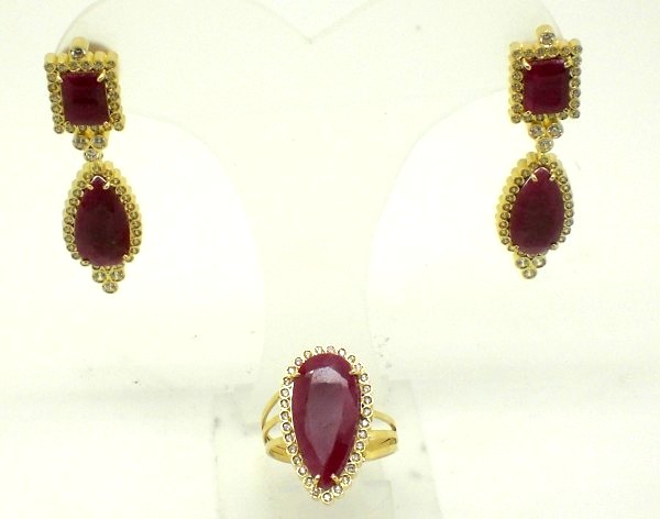 Anel e Brincos Rubis Indianos e Zircônios Ouro Amarelo 18k 750.