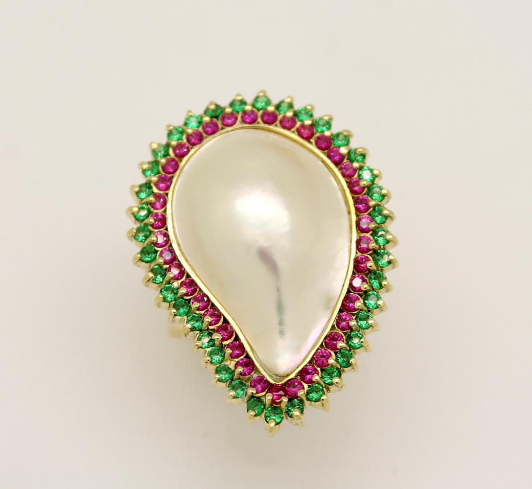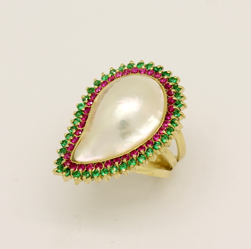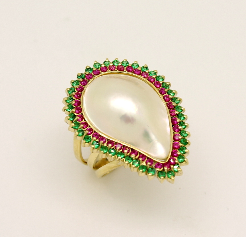 Anel Pérola Mabe Gota, Rubi e Esmeralda Ouro Amarelo 18k 750