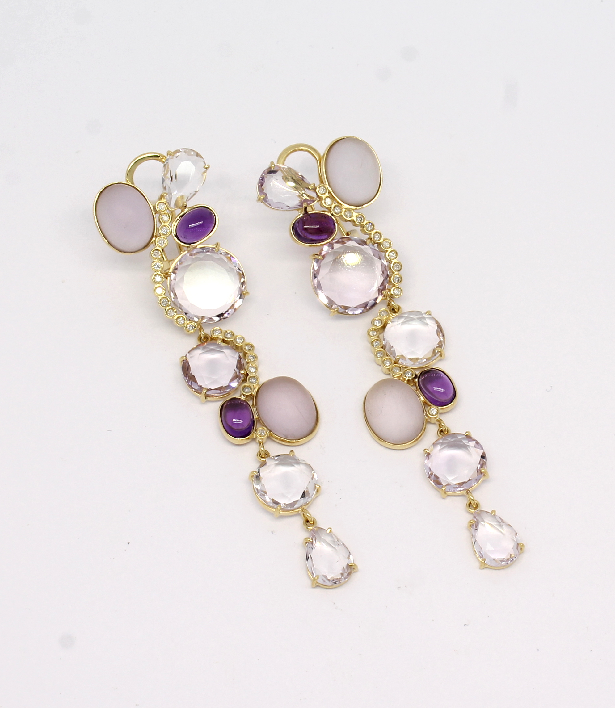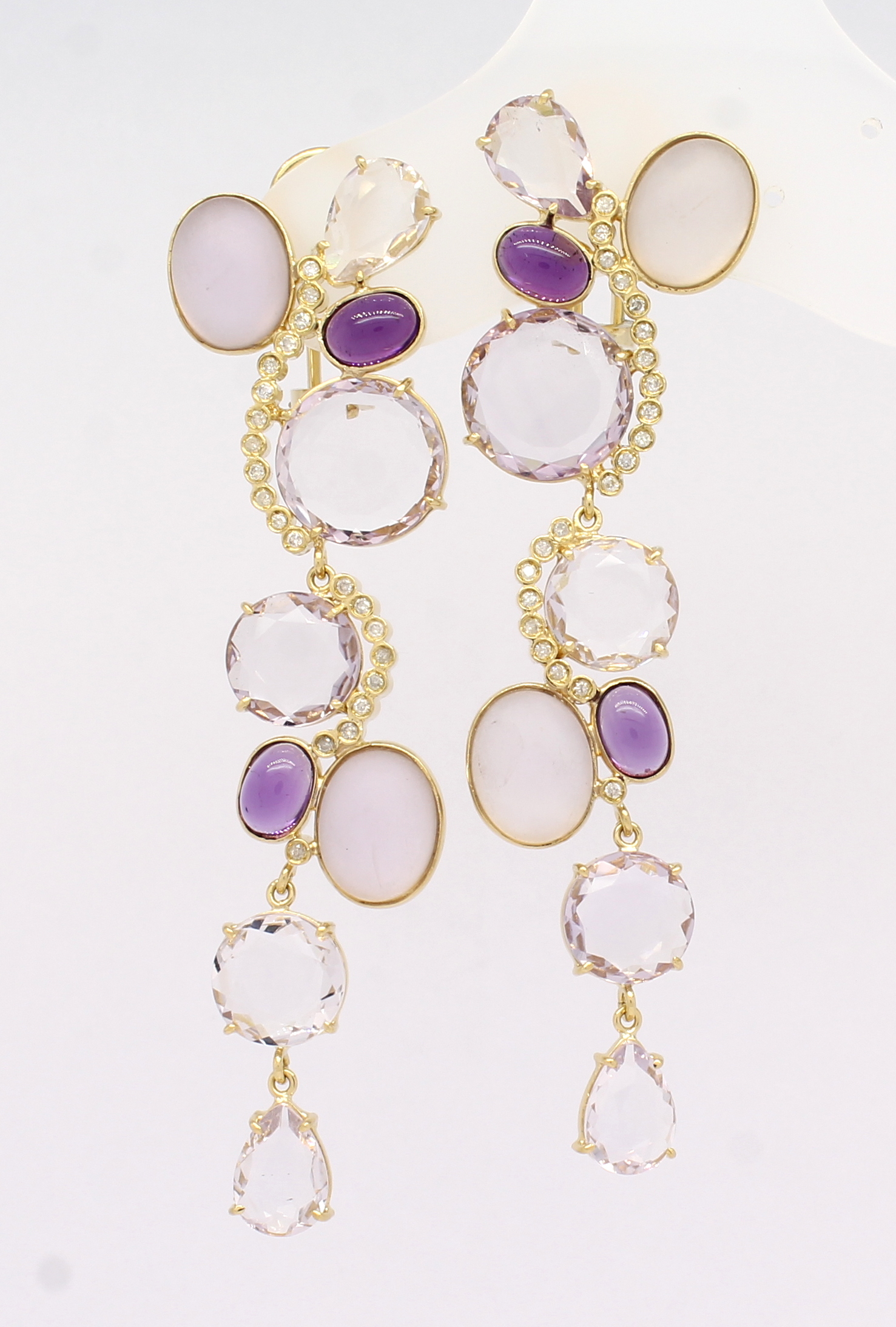 Brinco Ametistas e Diamantes Ouro Amarelo 18k 750