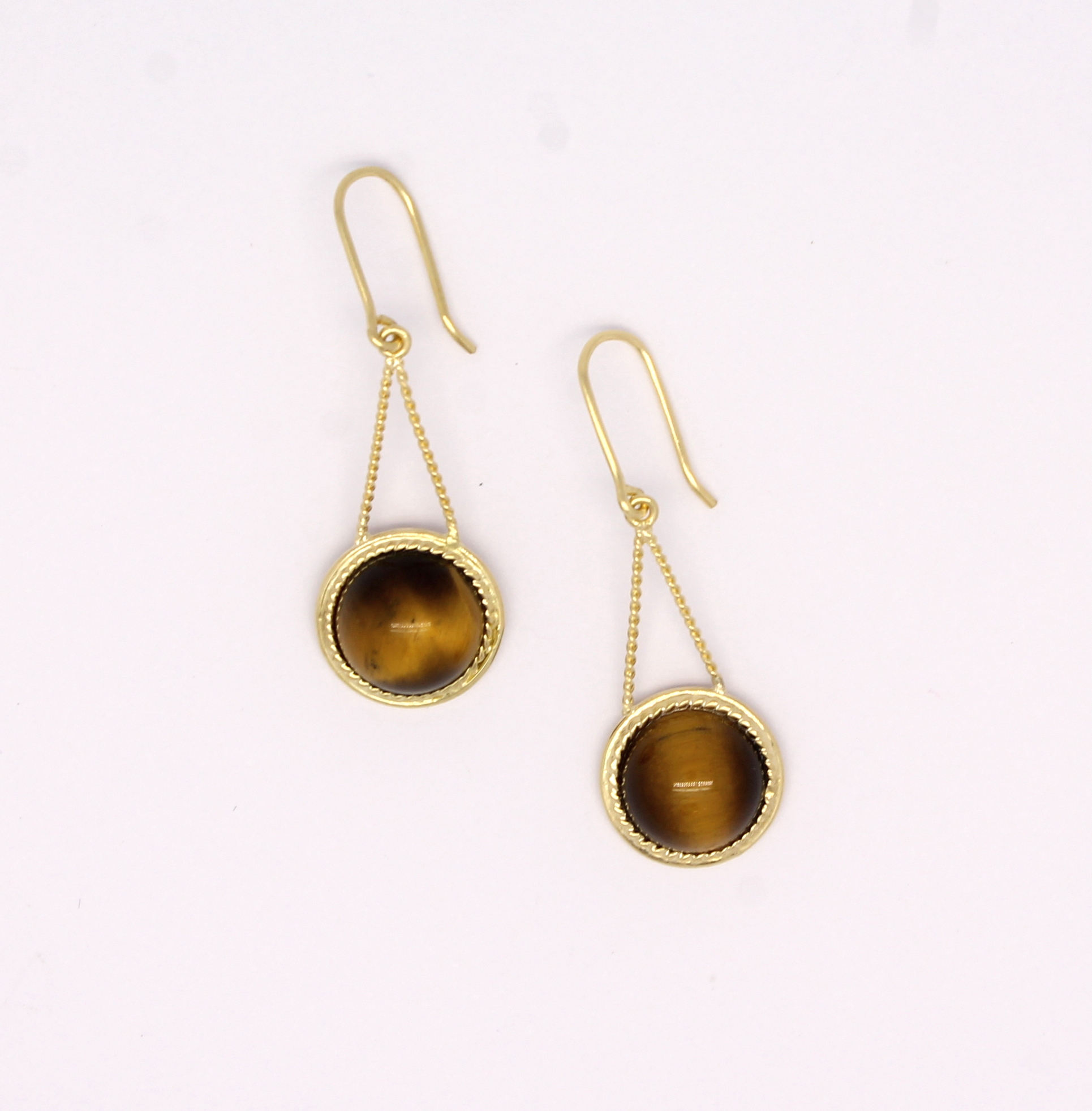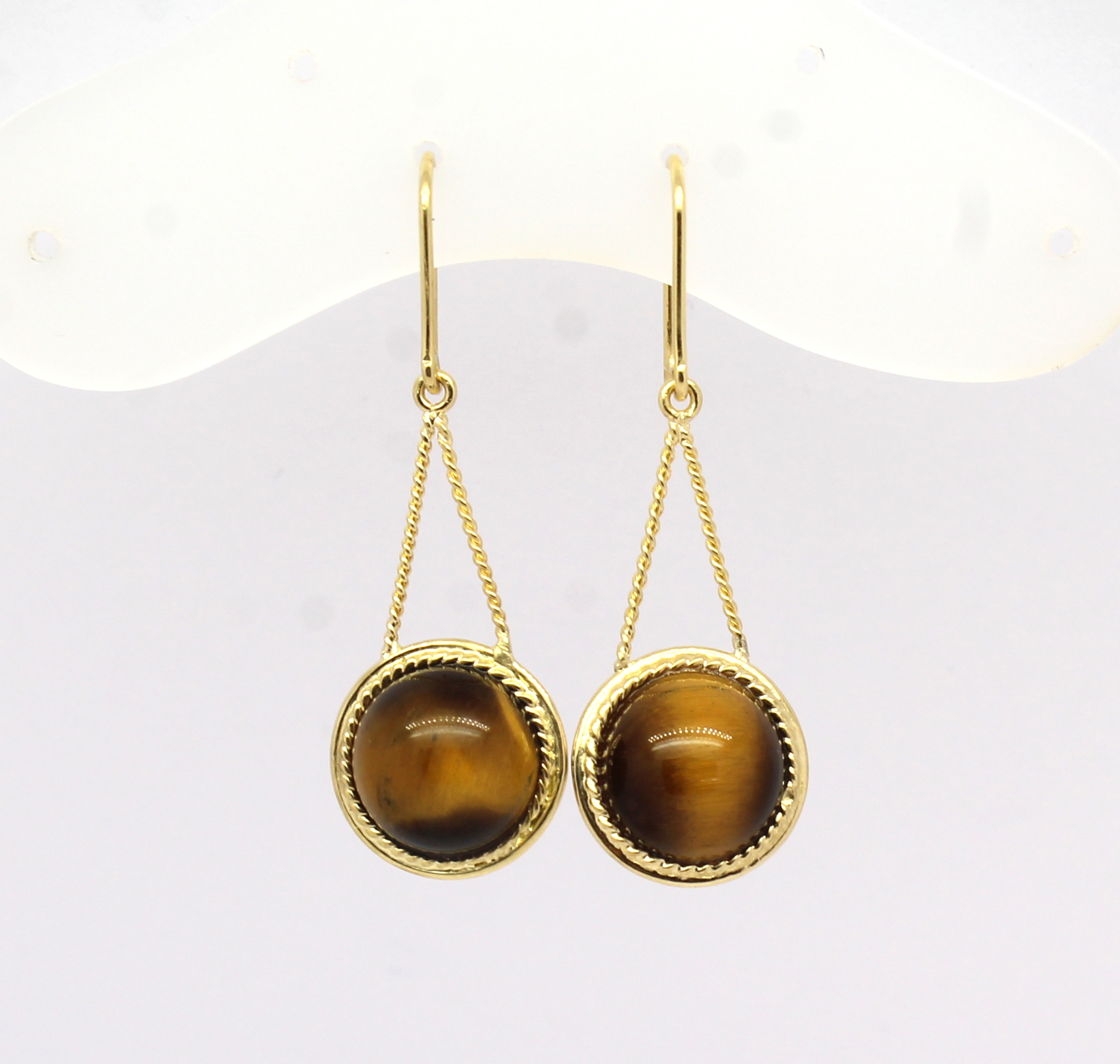 Brinco Pendurado Olho de Tigre Redondo Ouro Amarelo 18k 750