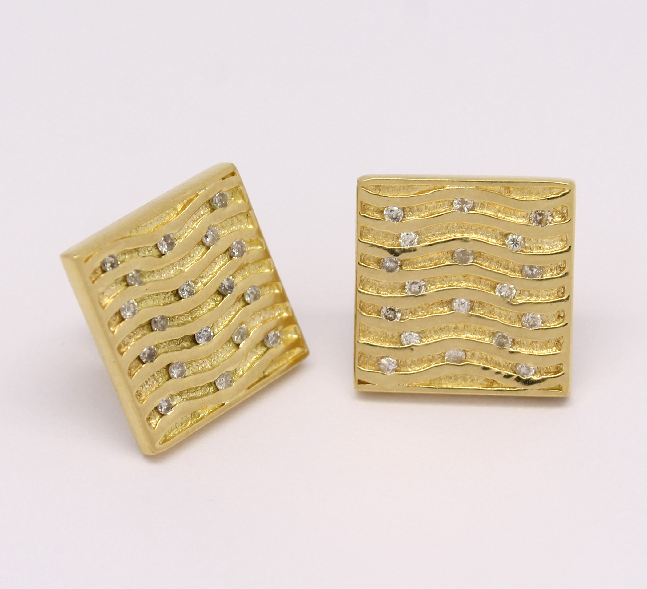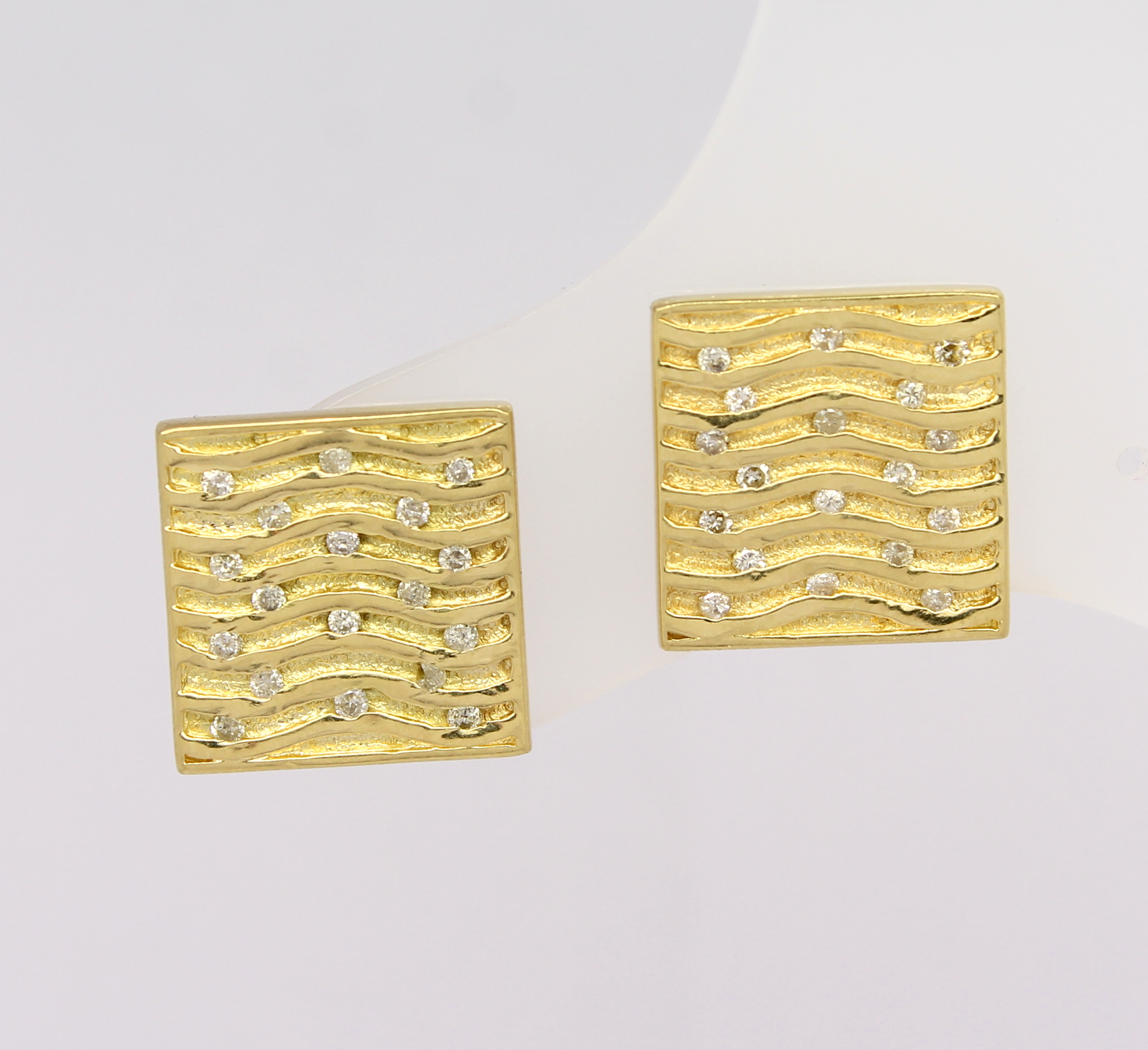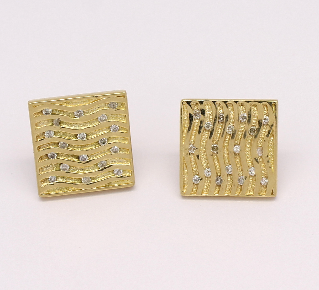 Brinco Quadrado Ondas Diamantes Ouro Amarelo 18k 750