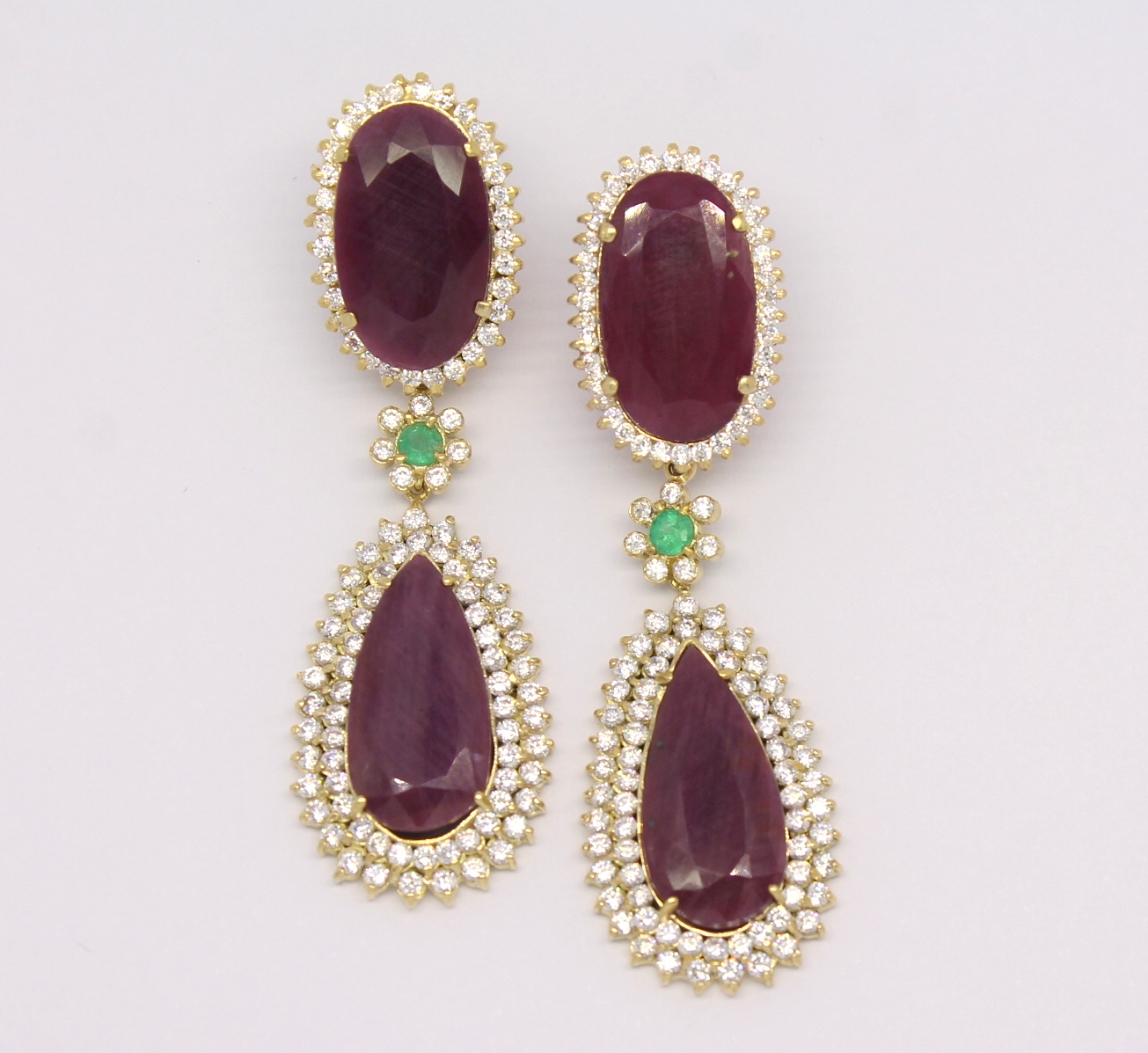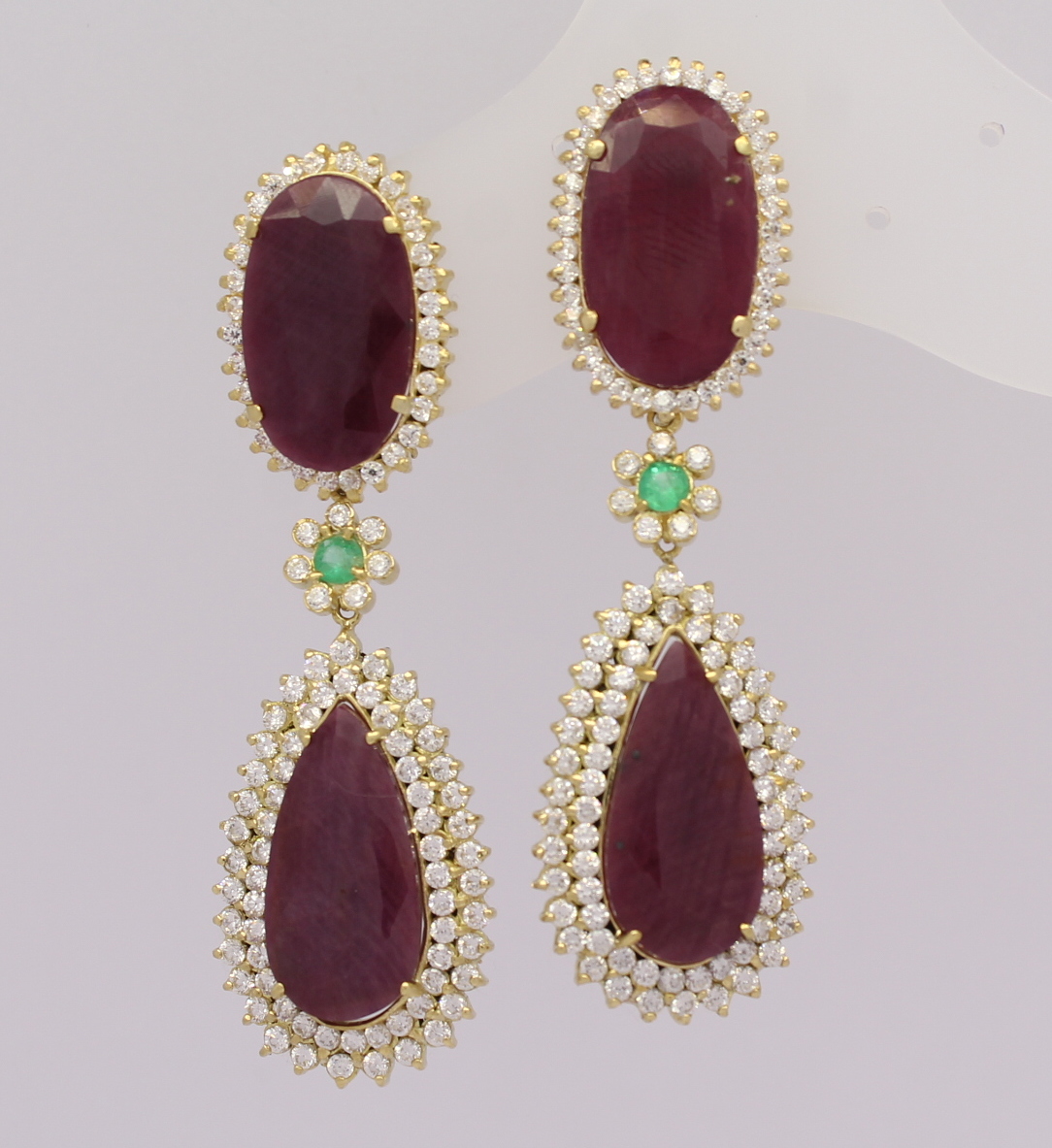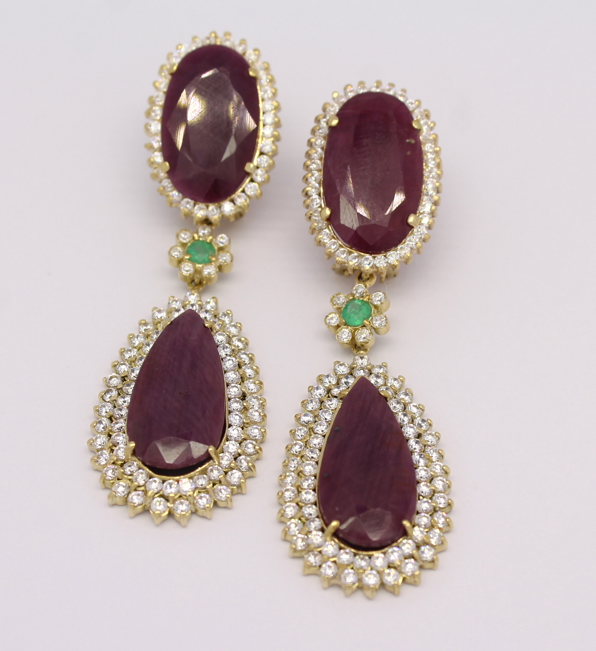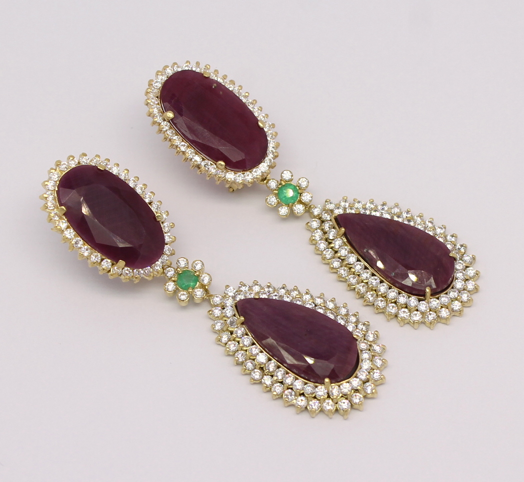 Brinco Rubi Indiano Esmeralda e Zircônios Ouro Amarelo 18k 750