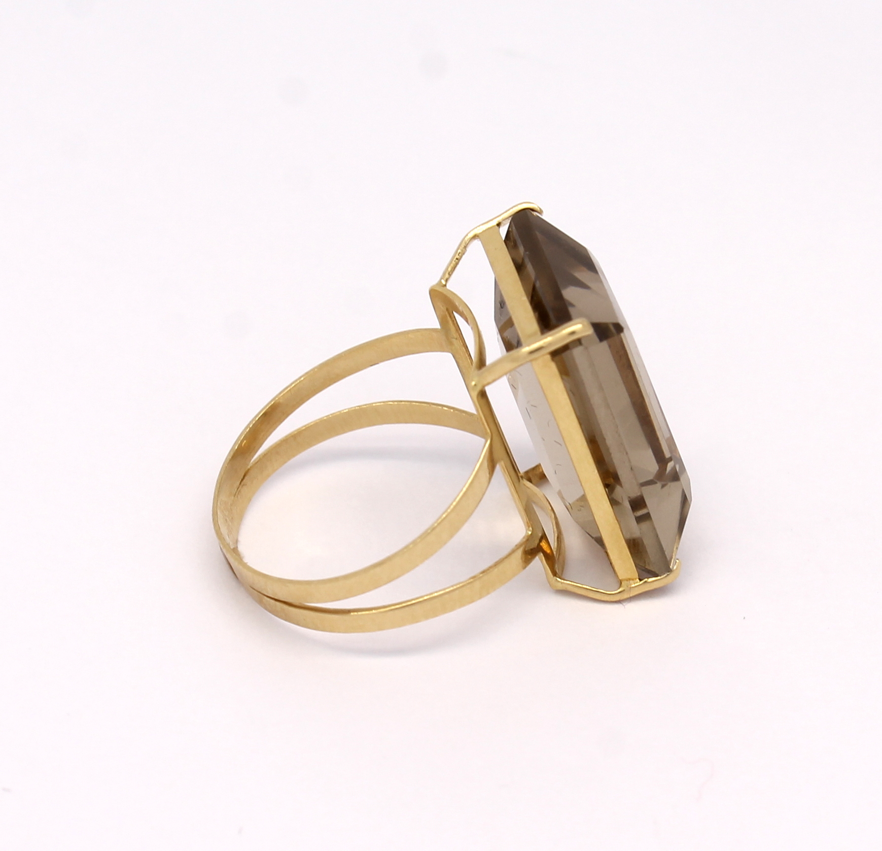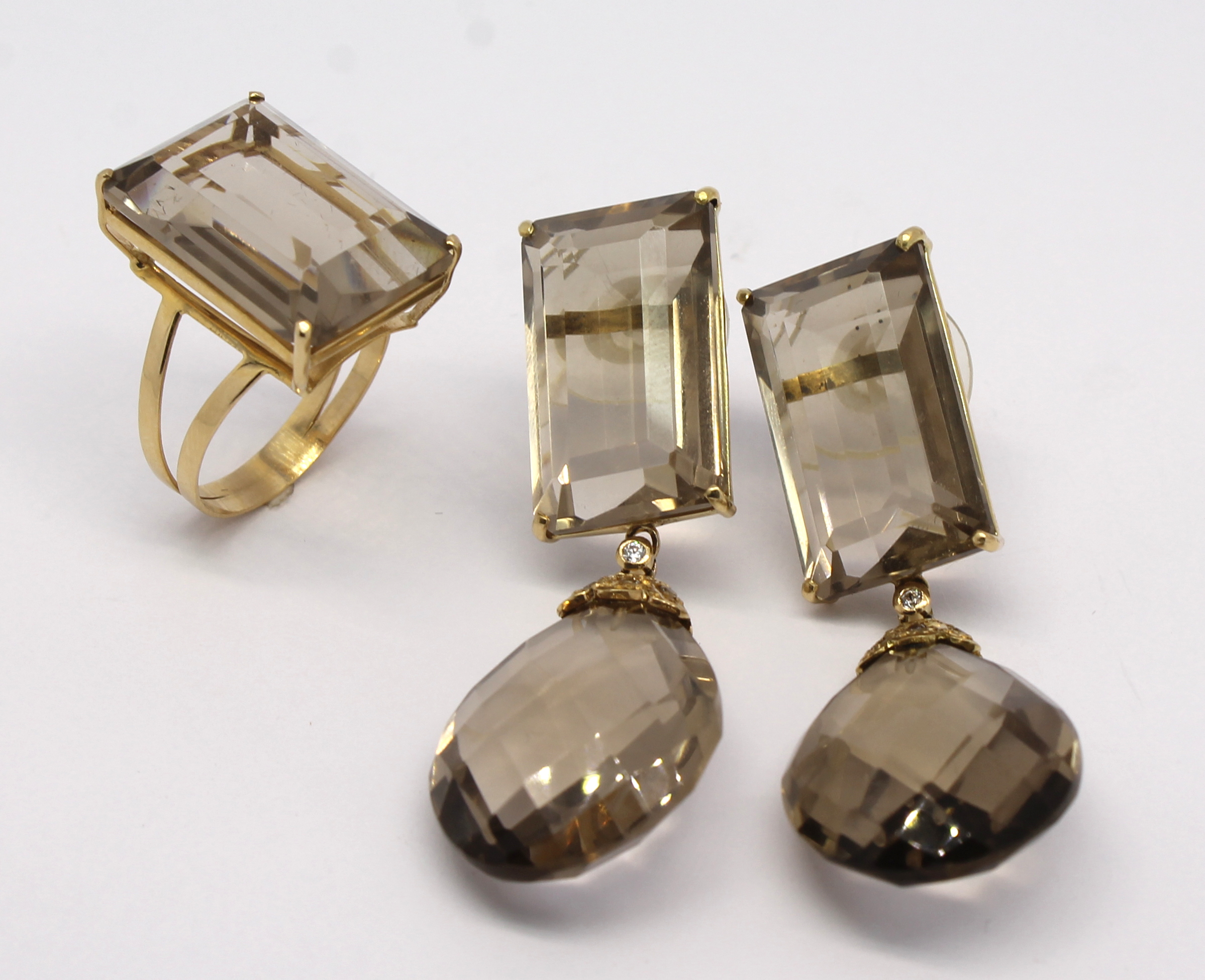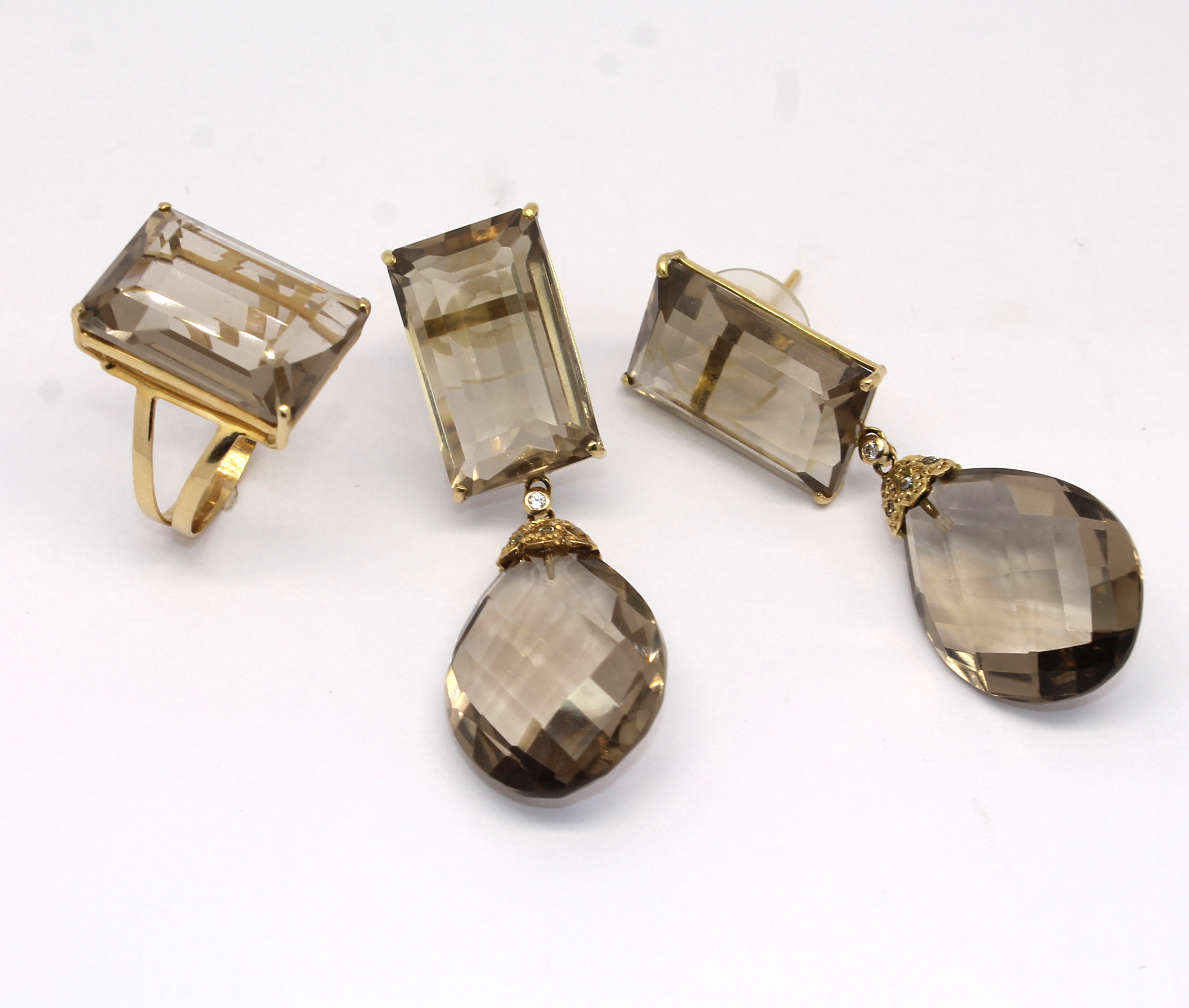 Conjunto Anel e Brincos Cristal Fumê Ouro Amarelo 18k 750