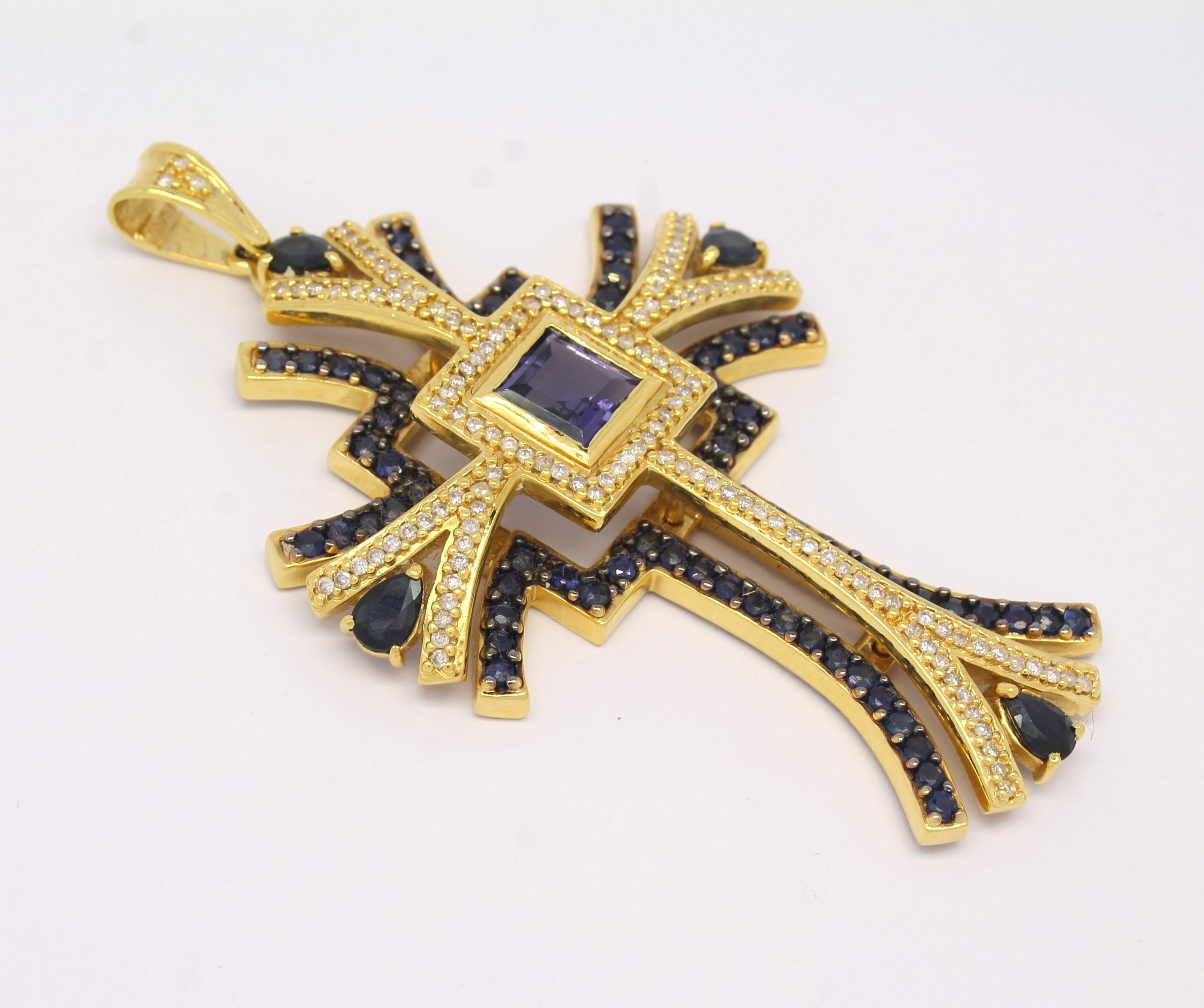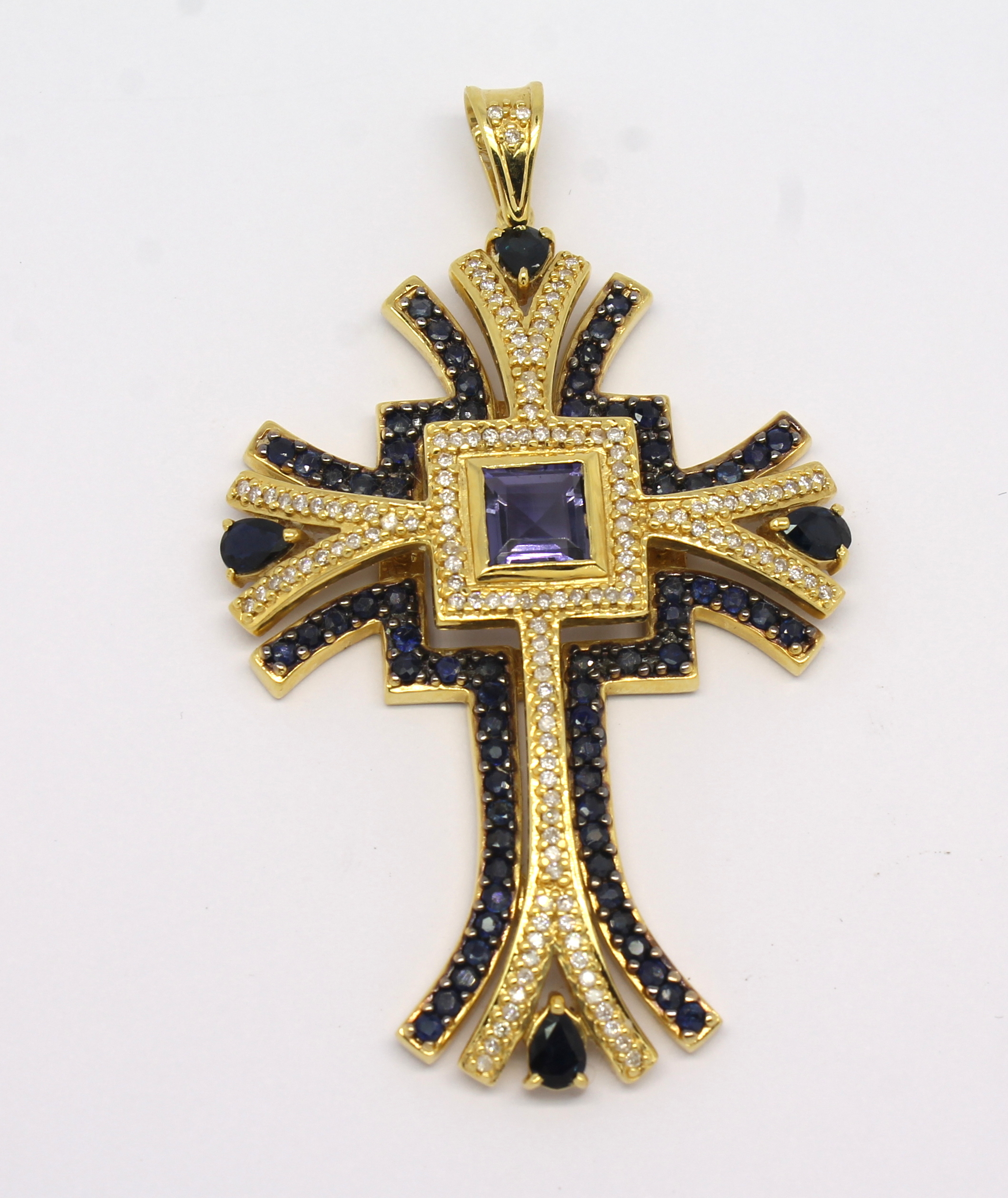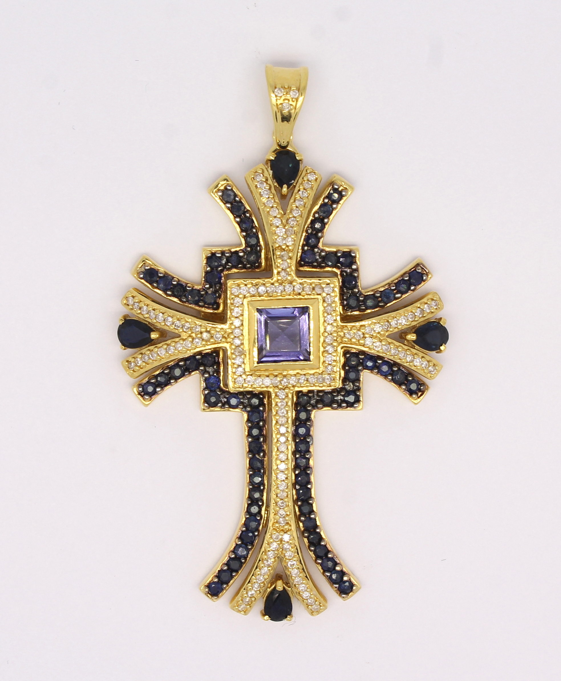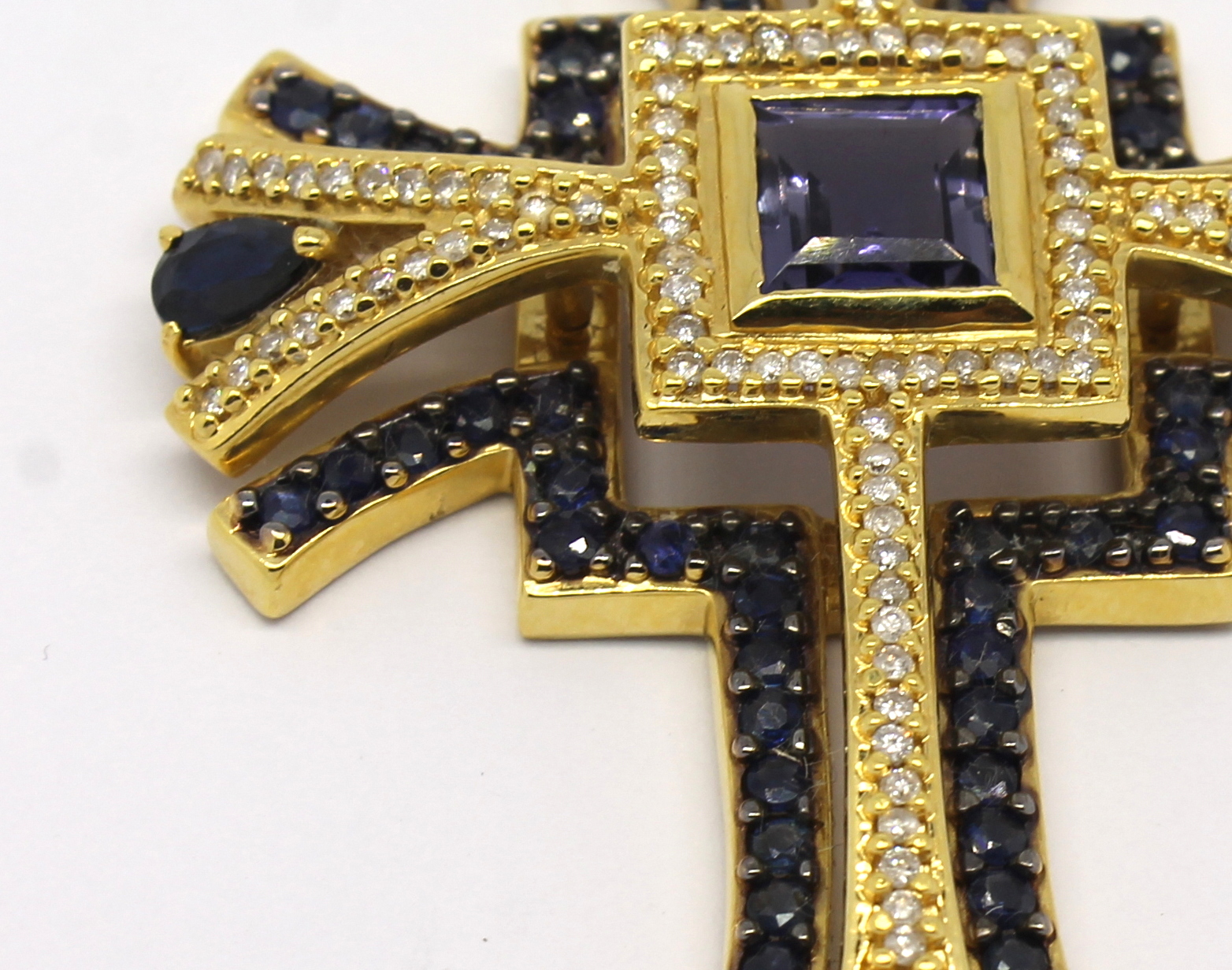 Cruz Diamantes e Safiras Ouro Amarelo 18k 750