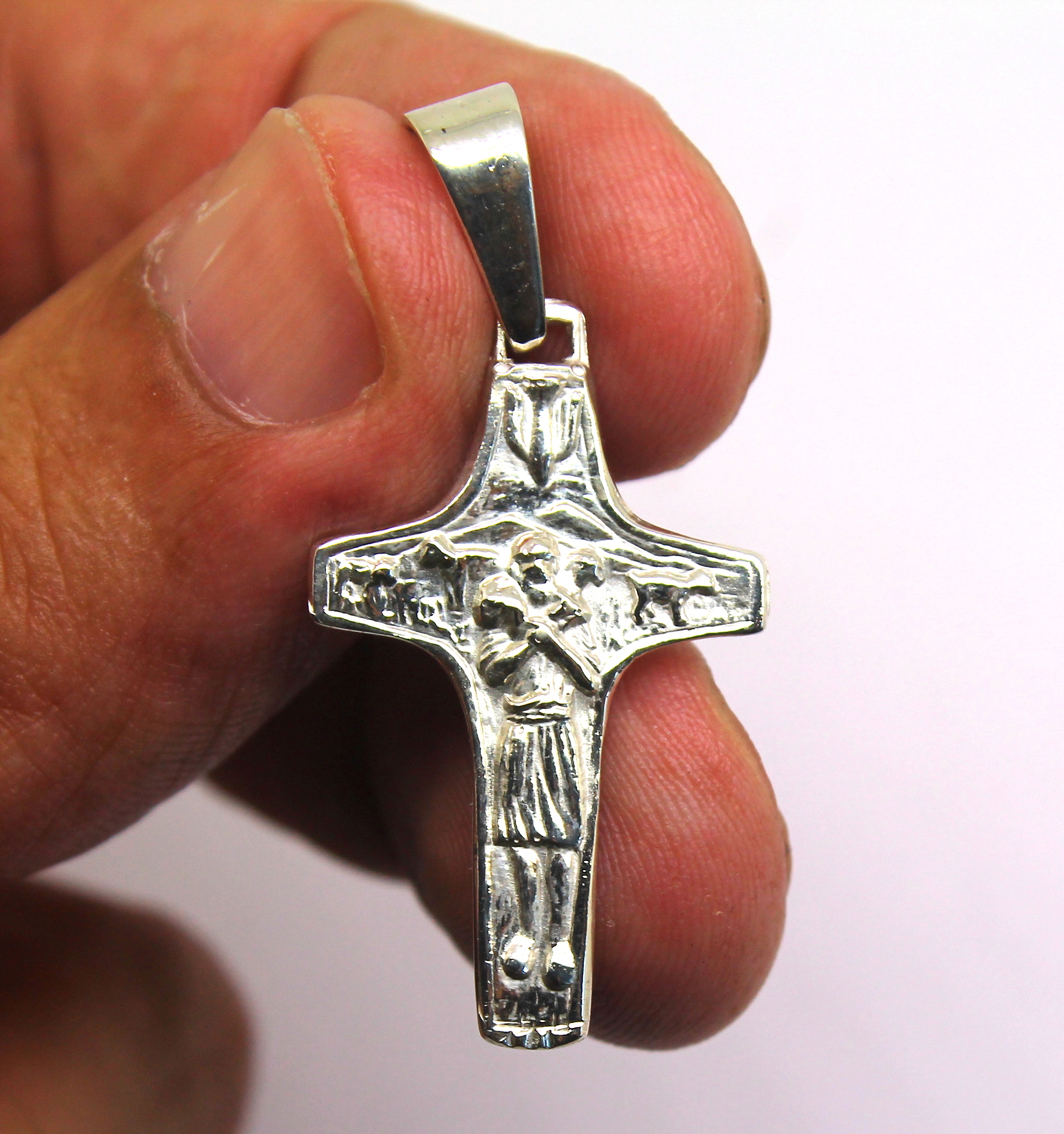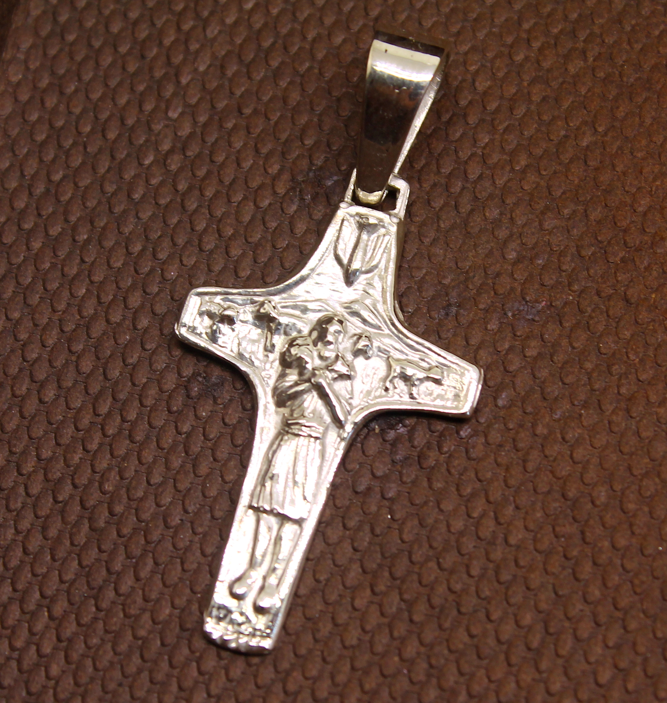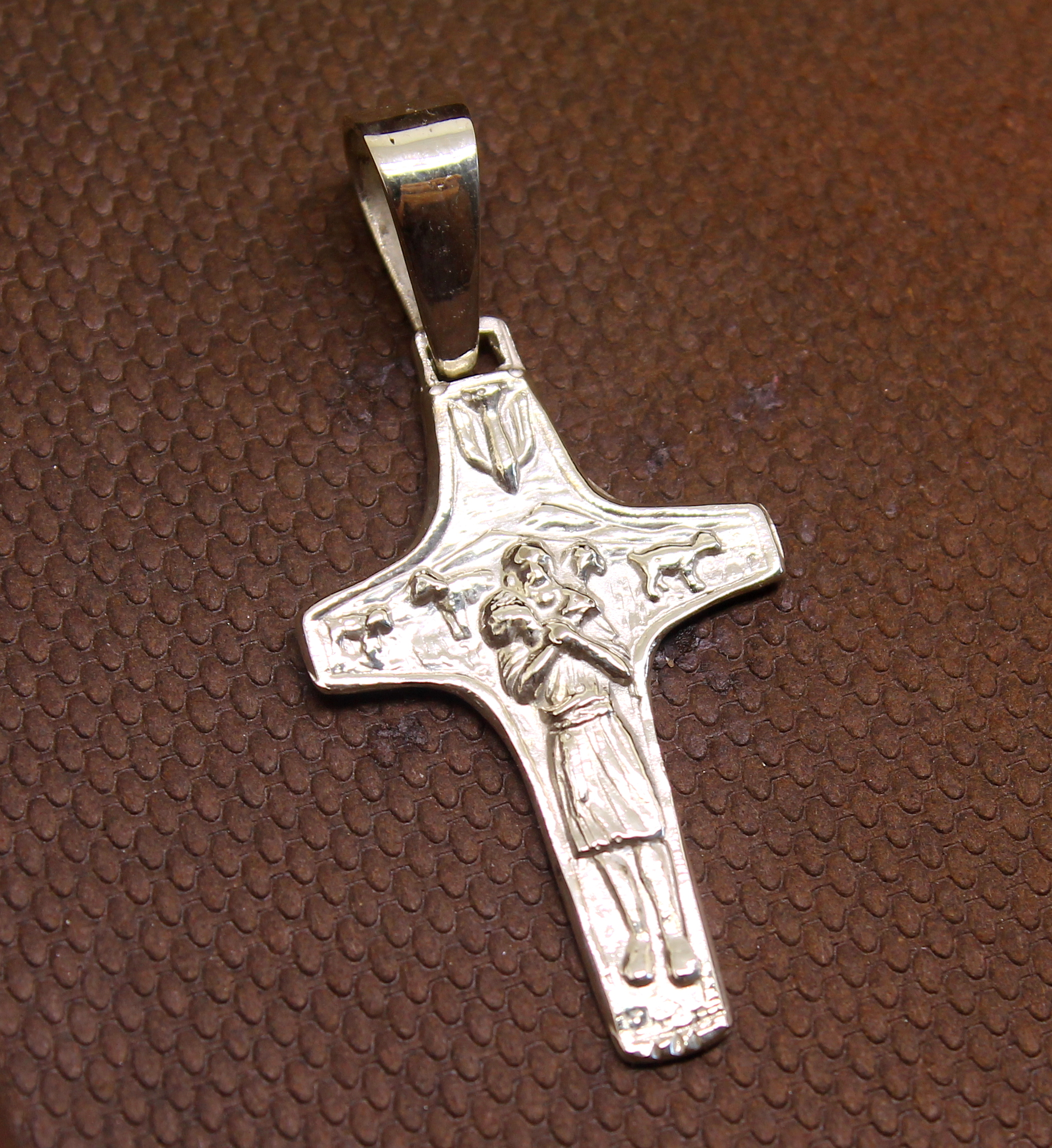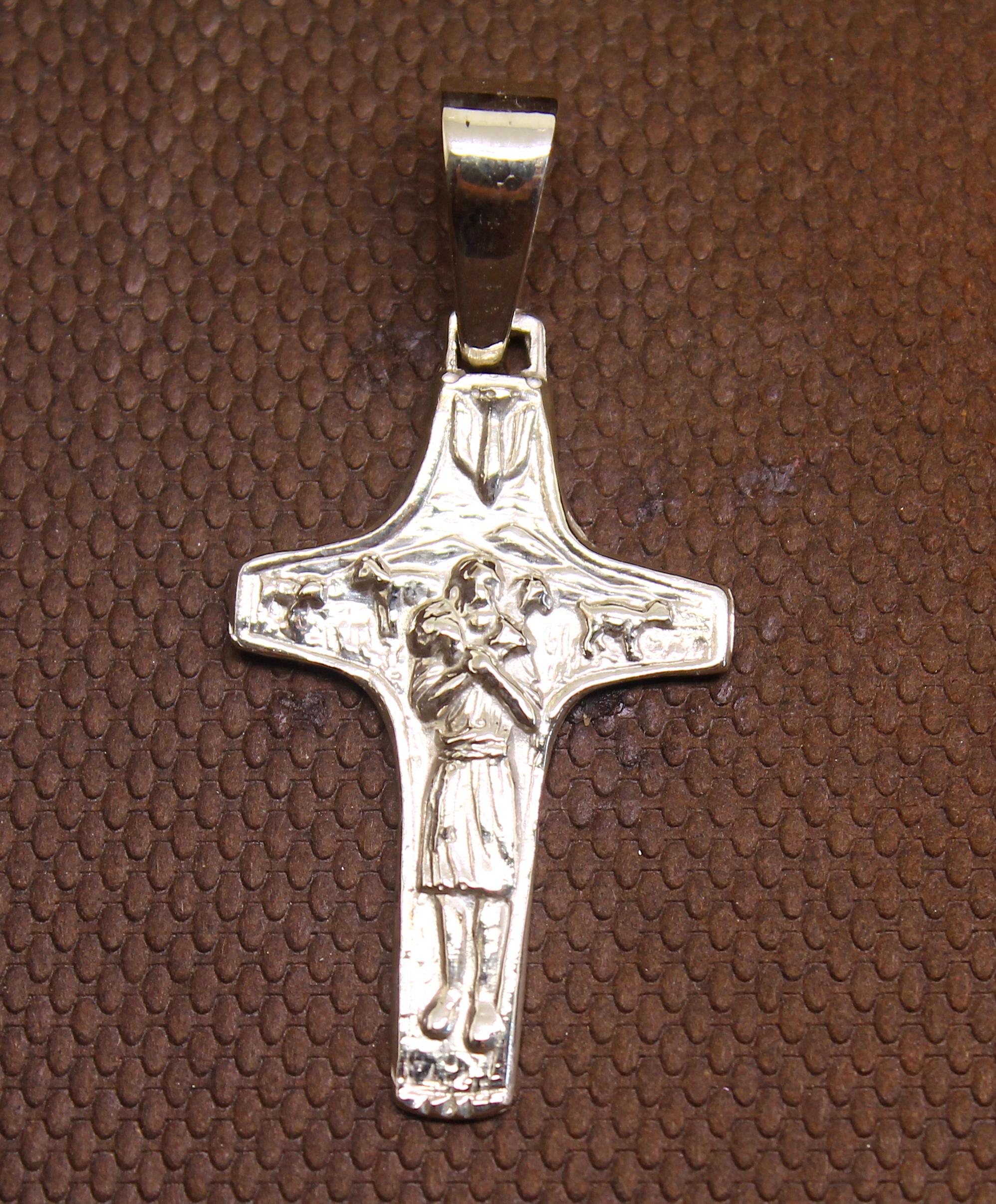 No centro da cruz, está o Bom Pastor. Como ele está no eixo, poderíamos pensar que representa a figura mais importante. No entanto, o maior símbolo é o que ele carrega: uma ovelha em seus ombros, ao redor de seu pescoço. Talvez a ovelha mais necessitada, a mais carente, aquela que tenha se machucado nas encruzilhadas da vida.