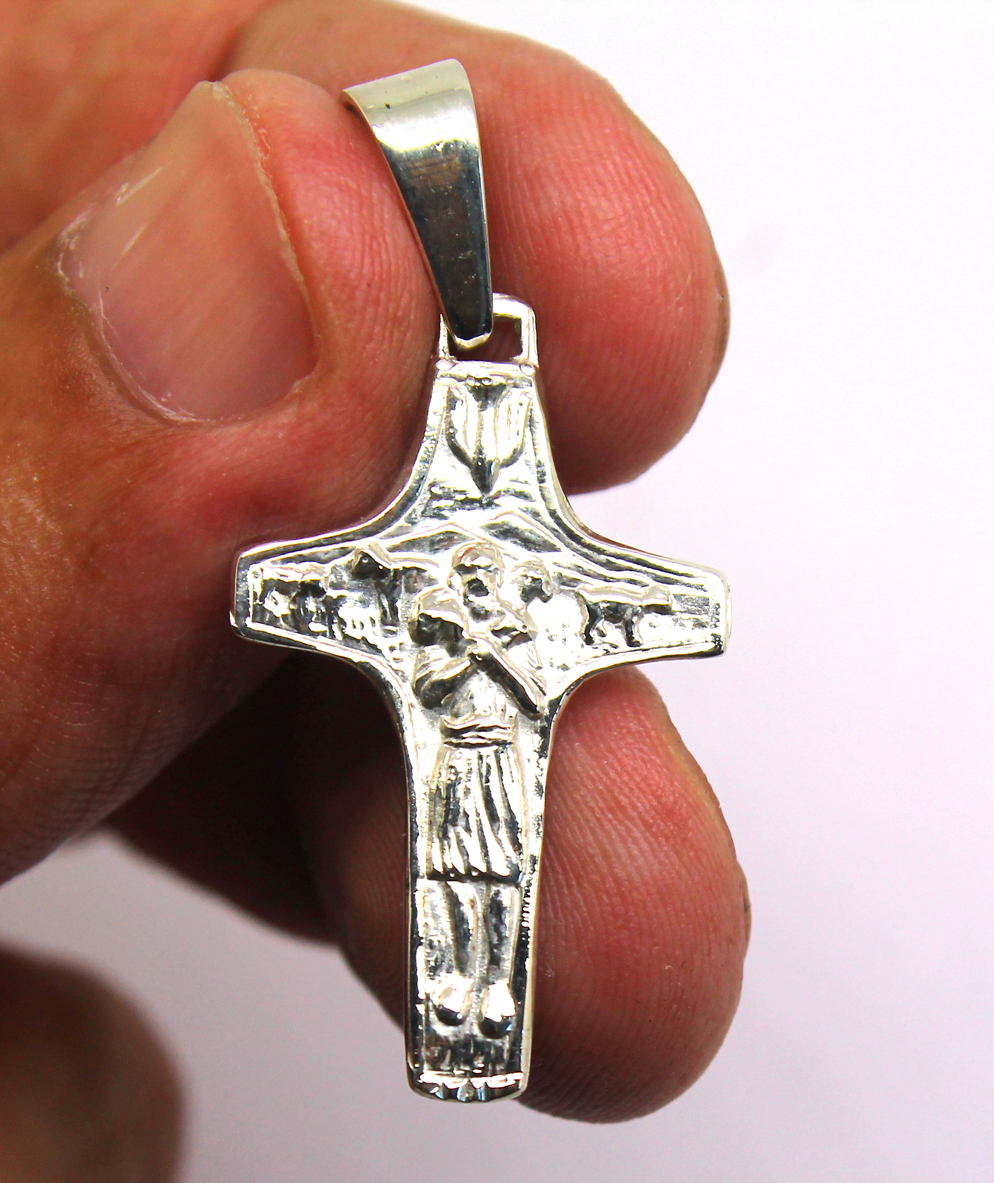A ovelha está tranquila sentindo-se segura, amada, nos braços do pastor que a ama. O pastor não é representado pelo clericalismo, pela pompa, por posses. De sandálias, com a roupa surrada, demonstra que não está preocupado consigo, com seu bem-estar, mas deseja ardentemente que suas ovelhas tenham vida. O pastor não fica na sacristia esperando que as ovelhas lhe beijem a mão, mas vai ao encontro da desgarrada e lhe beija as feridas.