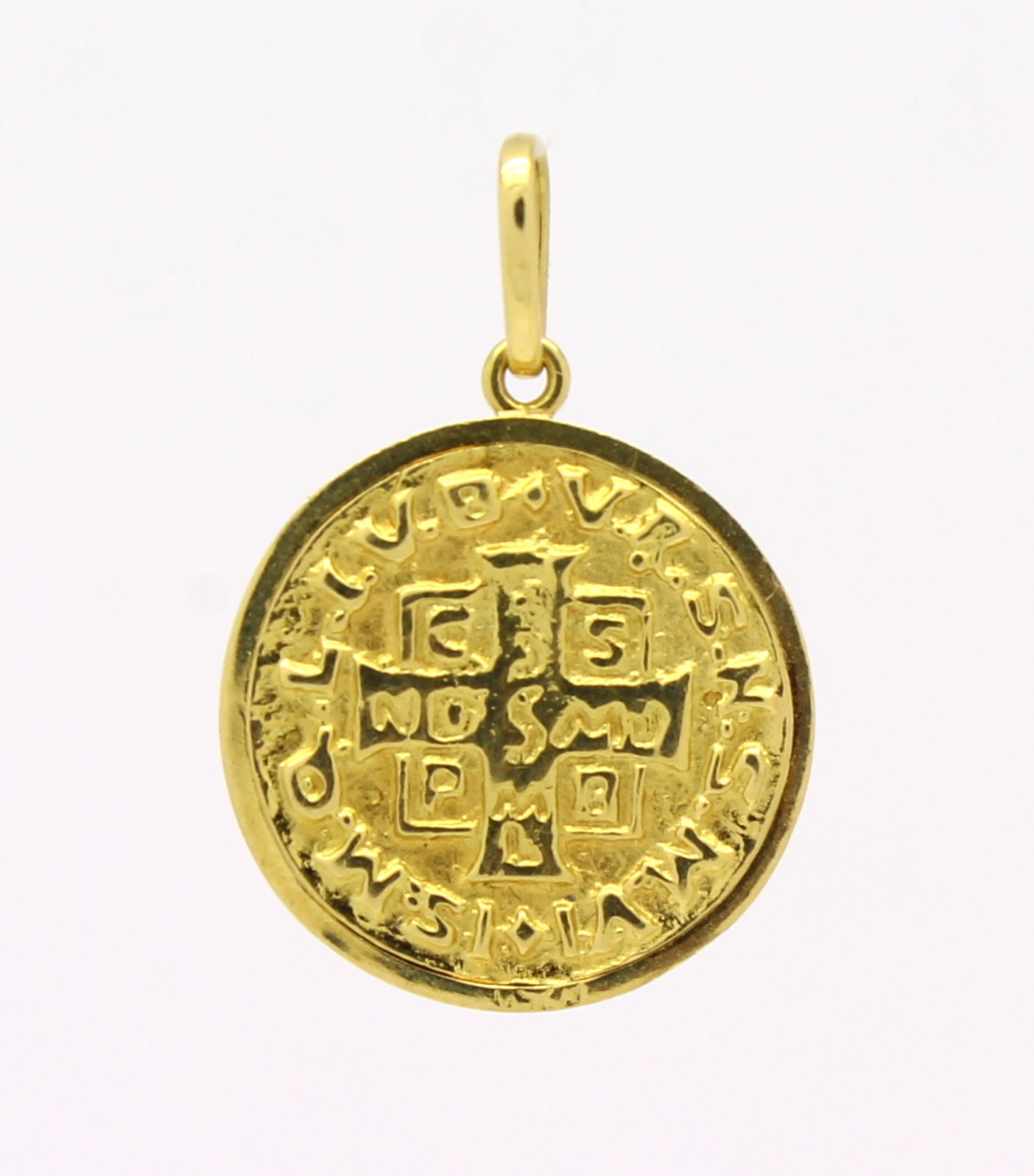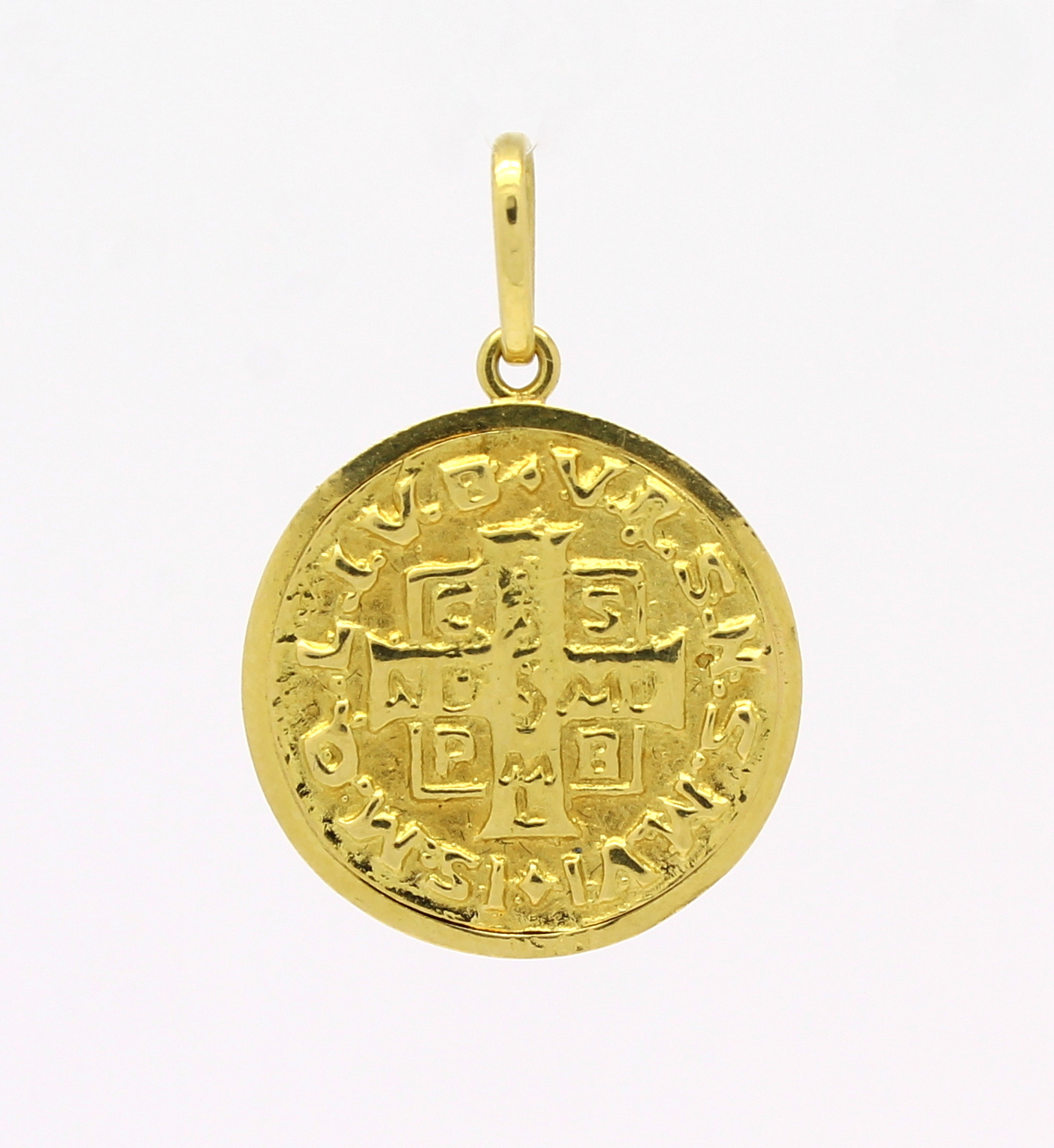 A medalha de São Bento foi esculpida primeiramente nas colunas do mosteiro de Monte Cassino. Na frente da medalha lê-se: Ejus in ibitu nostro praesentia muniamur. Sejamos protegidos pela sua presença na hora da nossa morte.