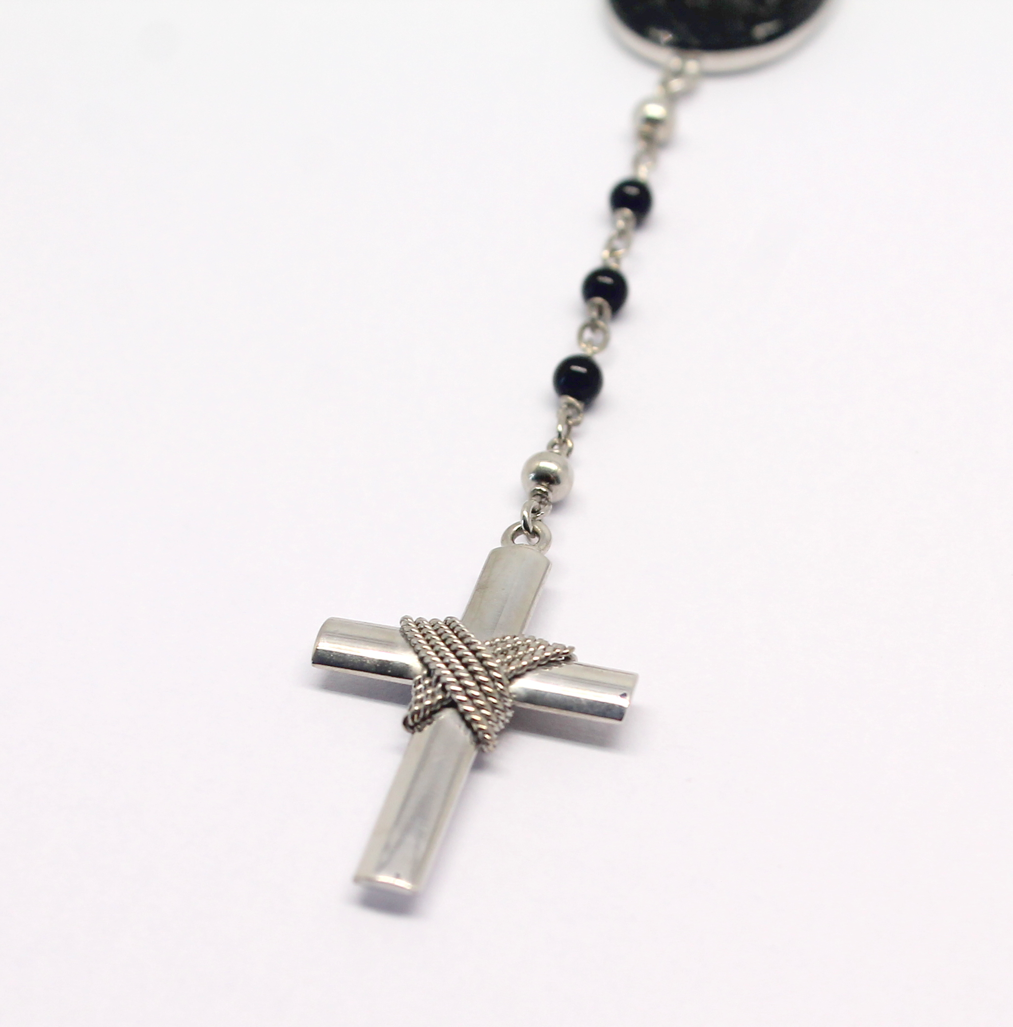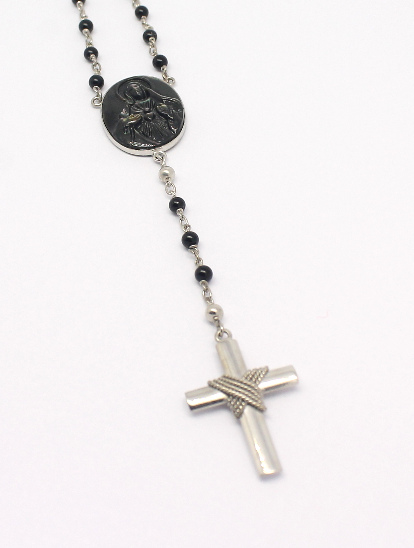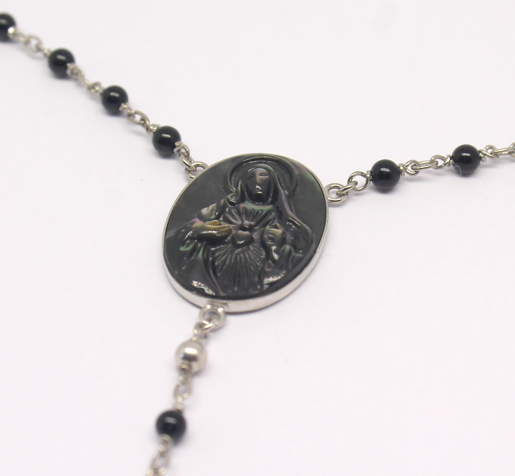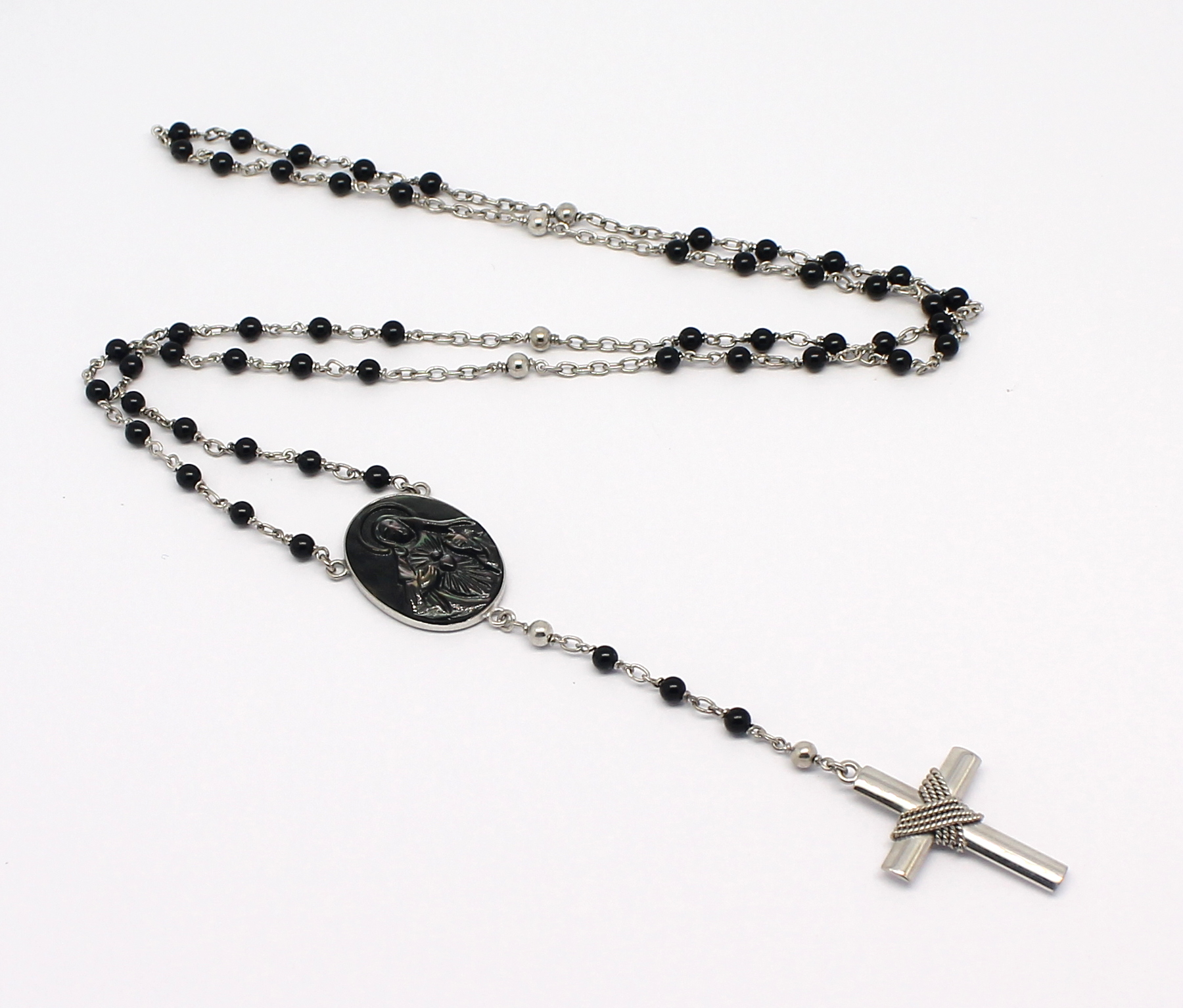 Terço em Ouro Branco com ônix e madrepérola.